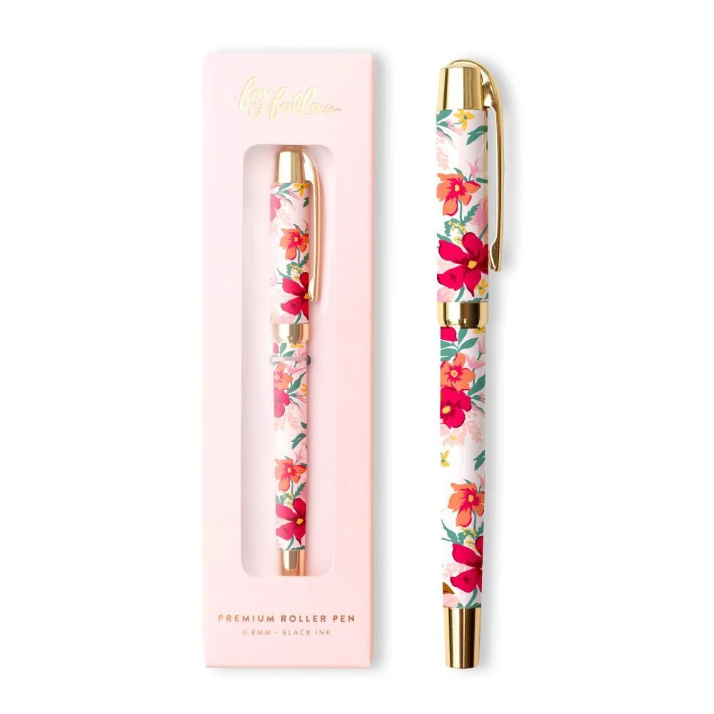 Material: Premium rollerball metal pen with gold foil and gold metal accents, refillable 0.8mm tip, black ink.