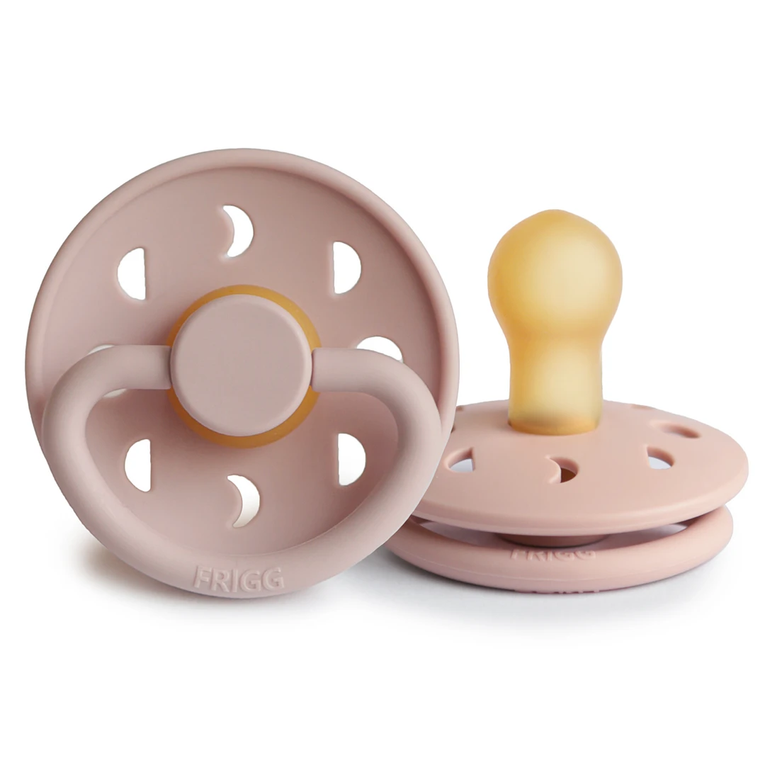 The FRIGG line of moon phase rubber pacifiers is thoughtfully designed for your baby’s comfort and inspired by the moon in motion. The outward curve keeps the pacifier off delicate skin, while air holes and a security handle ensure your baby stays safe. Within the pacifier shield, air holes reveal the eight phases of the moon in subtle detail. Available in a range of soft colors, FRIGG pacifiers make a beautiful addition to your collection of baby essentials.