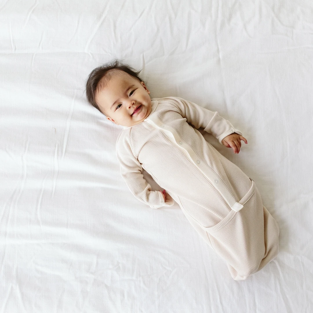 signature integrated mitts with pattern to boost brain development and prevent scratches plus a one-snap foot pocket to quickly change from gown to sleeper (perfect for those 2am diaper changes