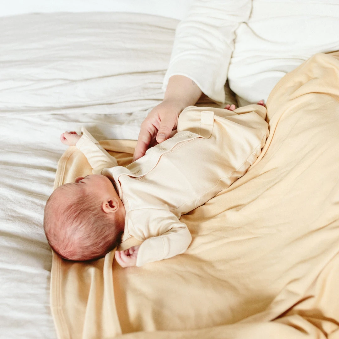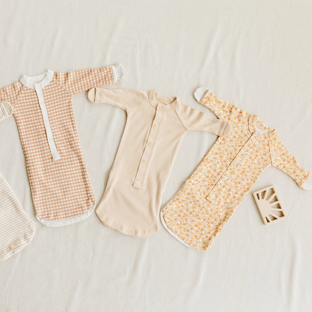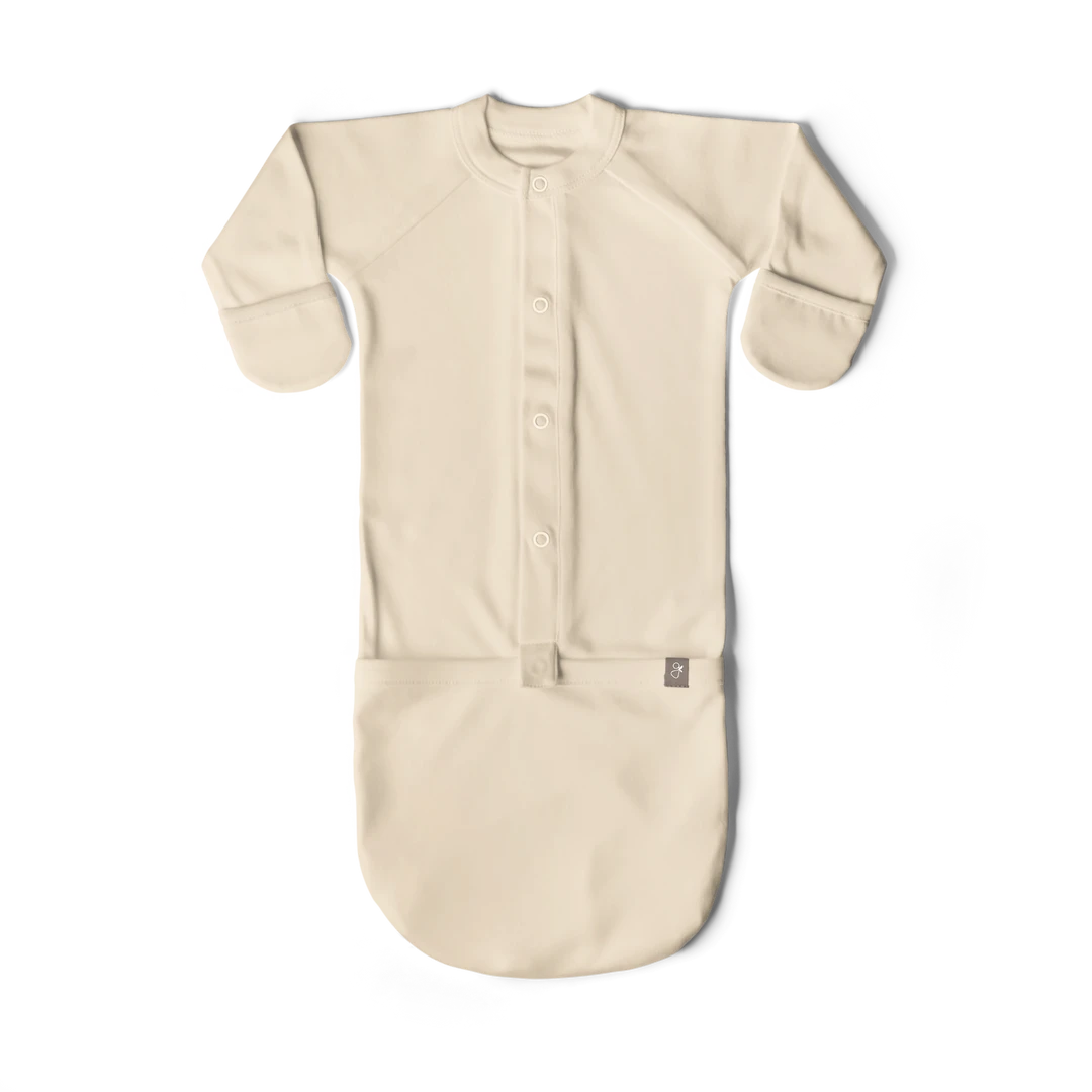 signature integrated mitts with pattern to boost brain development and prevent scratches plus a one-snap foot pocket to quickly change from gown to sleeper (perfect for those 2am diaper changes
