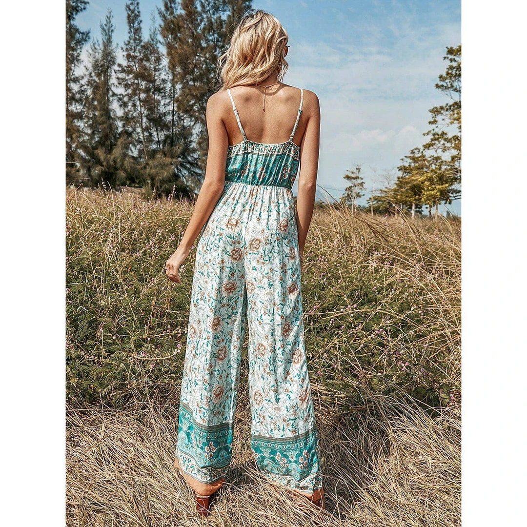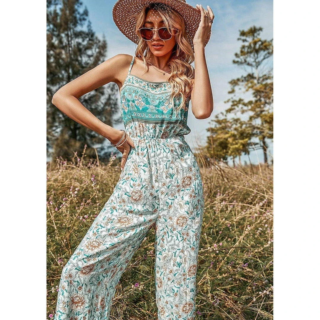 J+j Green Floral Boho Jumpsuit