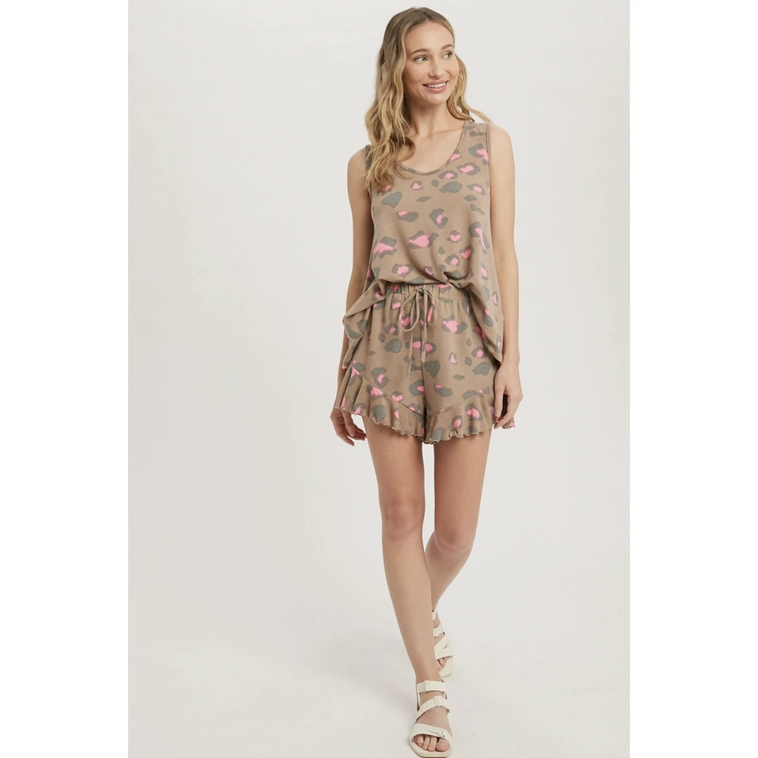 features an allover leopard print + sleeveless + scoop neck + a trapeze silhouette top