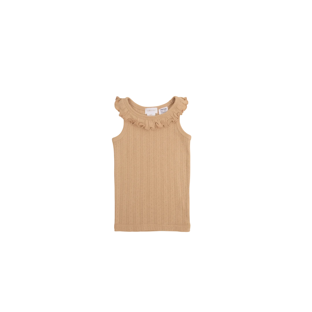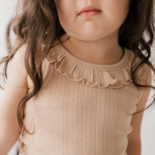 This singlet top is a great addition to my wardrobe. The organic cotton feels amazing, and the chai caramel color is so chic. The frill detail is a nice touch, though I wish it came in more colors.