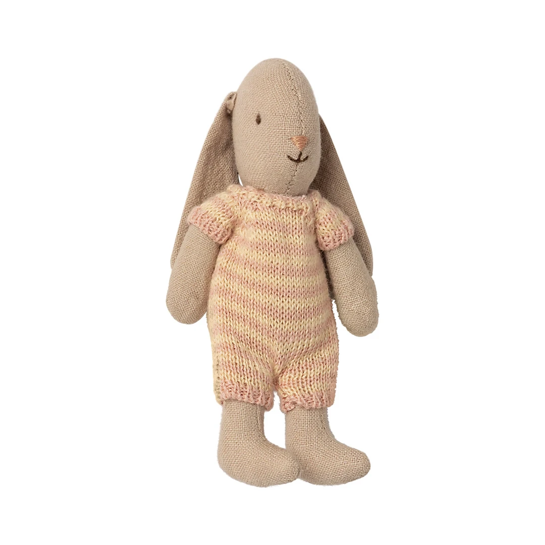 This sweet bunny in micro size is dressed in a striped suit knitted in a soft linen/cotton blend. It fits all the micro size furniture and will surely lead to many hours of play! The knitted suit is made in 3 lovely color combinations.