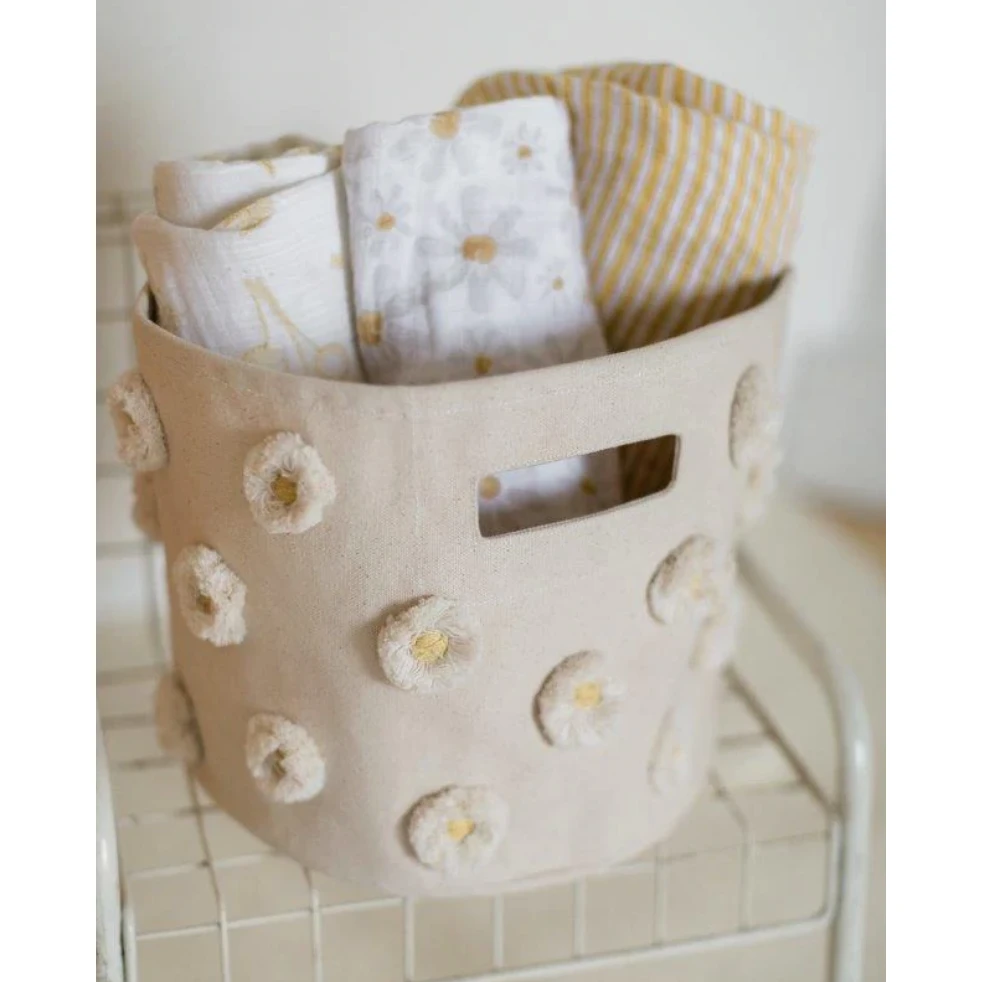 Our Daisy Pint is in bloom! Brighten any space with these friendly flowers. Made in our signature canvas with sweet daisy pom poms and marigold stitched centers, it’s the perfect size to store swaddles, books, toys and more.