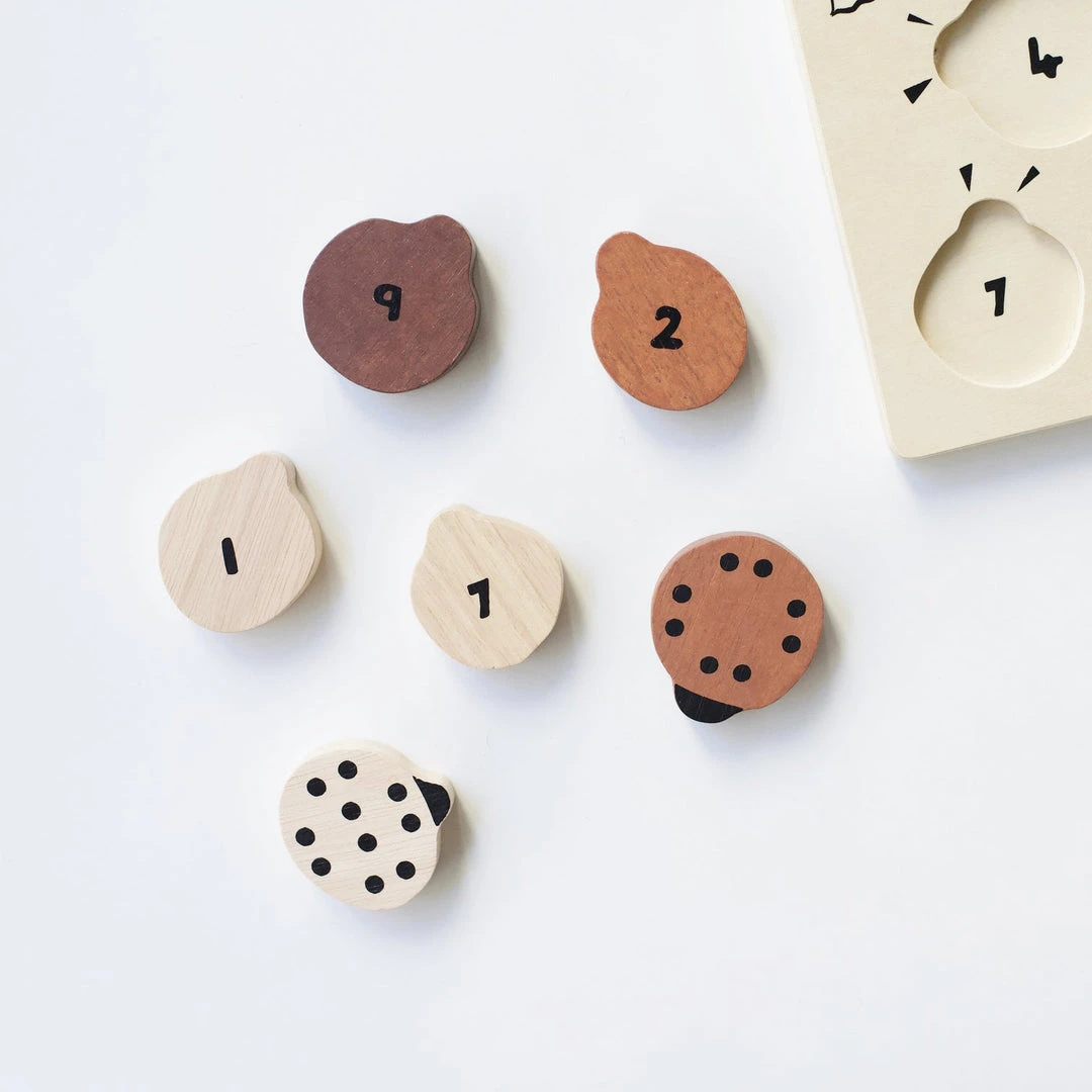This beautiful wooden puzzle is a fun and challenging way to explore numbers! As counting skills improve, children will be able to solve the puzzle by matching the numbers to the dots on the ladybugs.